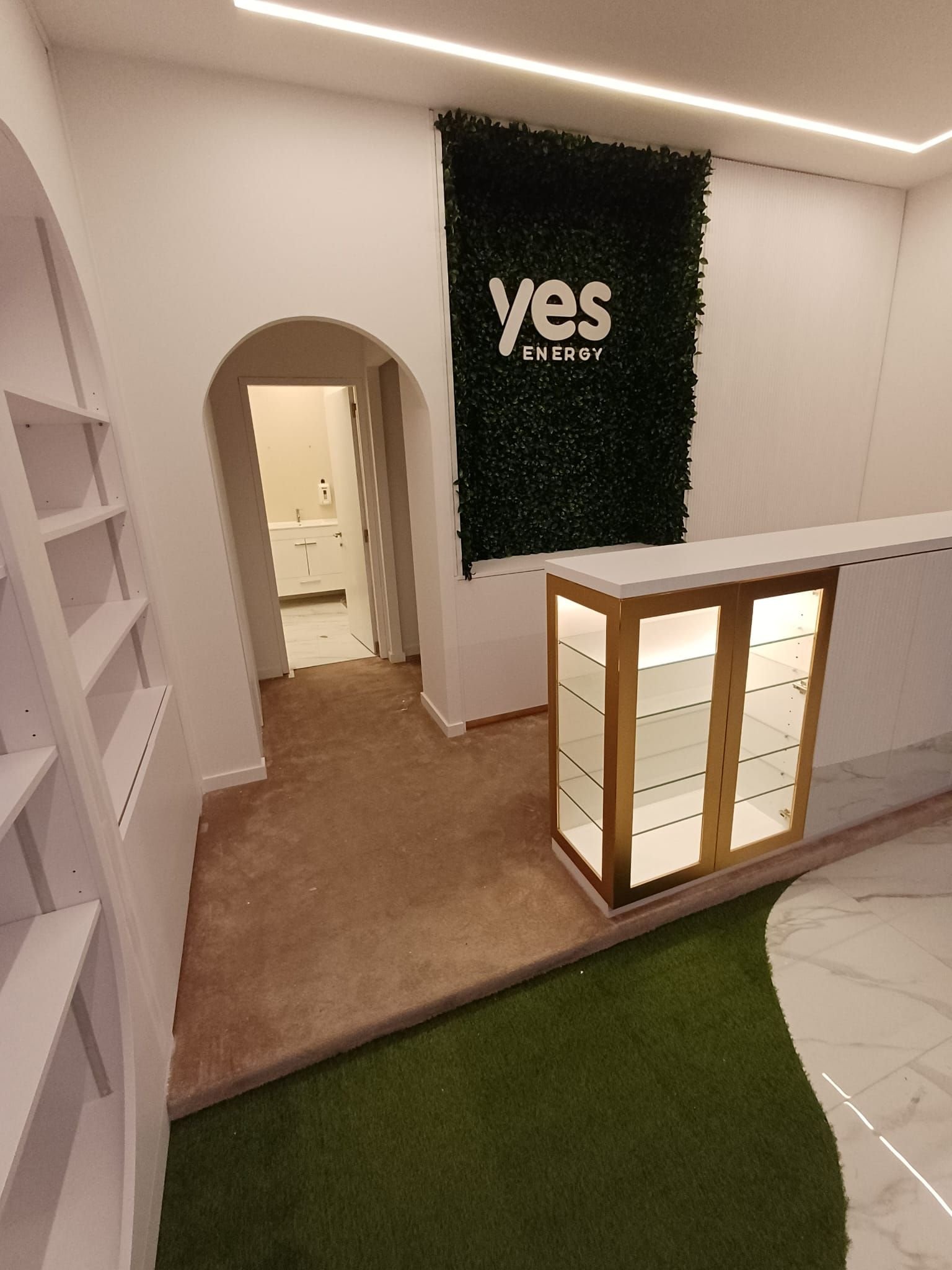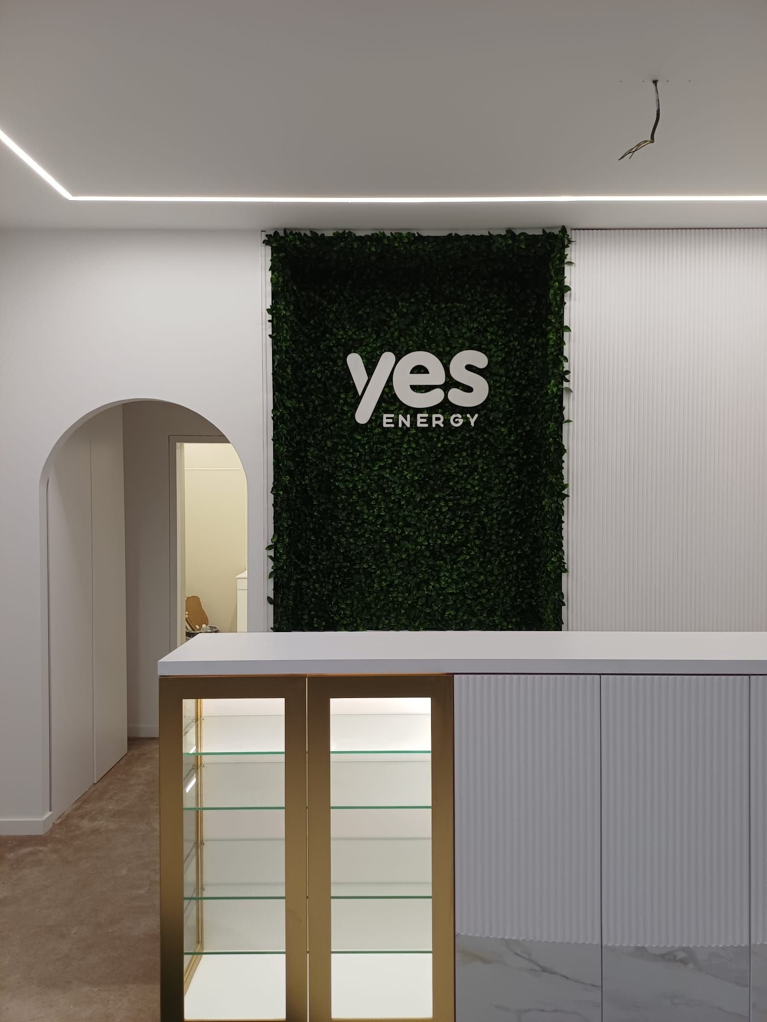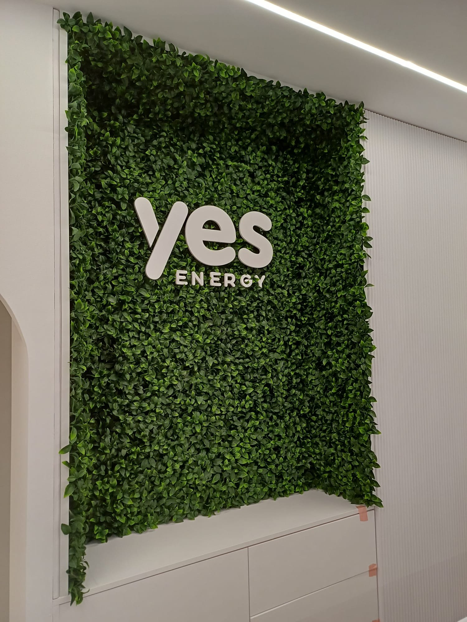 A parede principal ganhou um jardim vertical artificial premium, com vegetação densa e logo “Yes Energy” personalizado em relevo, criando um impacto visual imediato e sustentável.