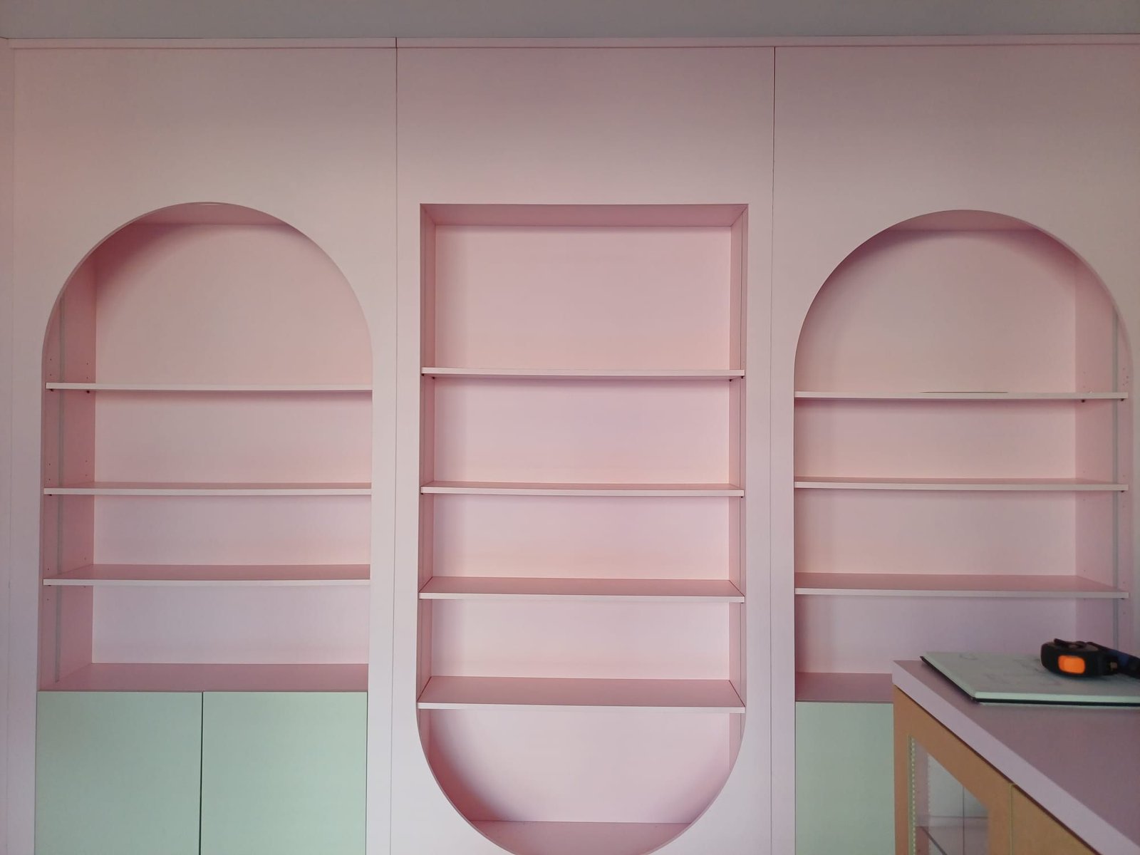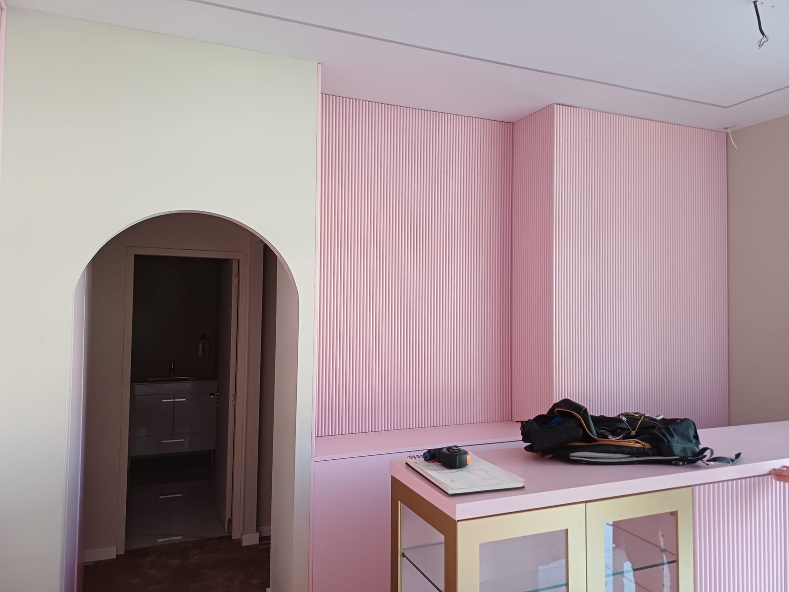 Complementámos com pintura em tons neutros profissionais, ripas brancas e iluminação LED, neutralizando o antigo rosa saturado para um design clean e contemporâneo.