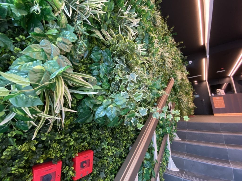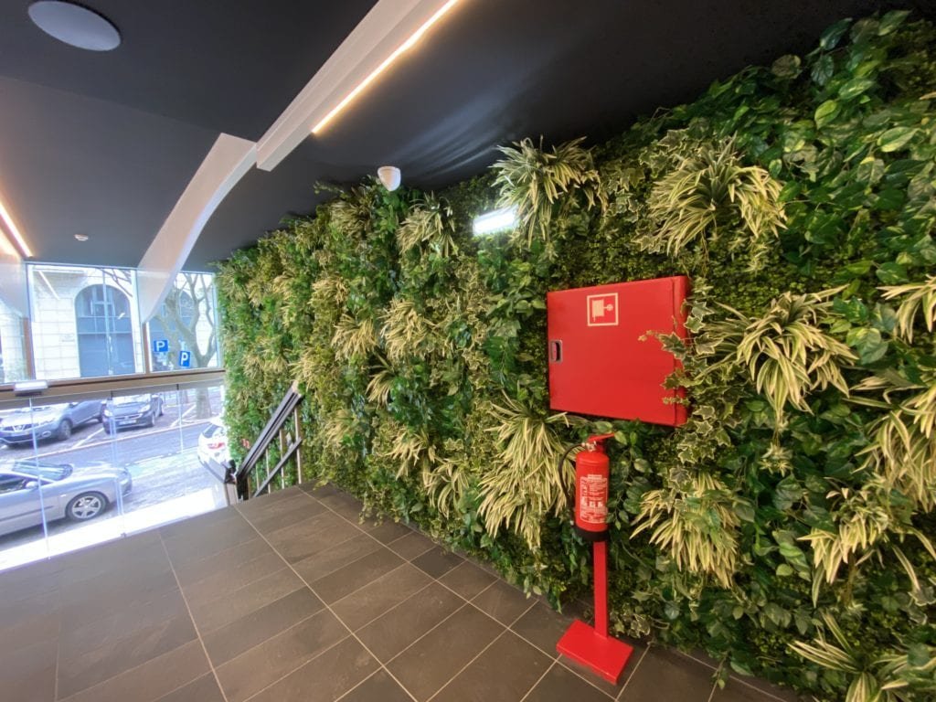 O desafio central neste projeto em Lisboa era preencher uma parede extensa junto à escadaria principal com um elemento orgânico que fosse visualmente apelativo e, ao mesmo tempo, funcional e duradouro. A solução da MossnArt passou por um jardim vertical artificial de alta fidelidade, composto por um mix premium de folhagens que mimetizam a biodiversidade natural. A instalação integra-se perfeitamente com a arquitetura moderna do edifício, emoldurando de forma natural os elementos de sinalização e segurança.