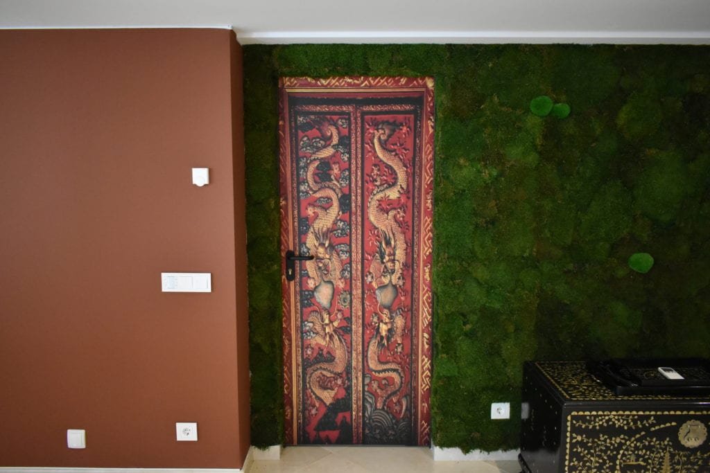 O desafio neste projeto residencial era criar uma parede viva que proporcionasse conforto acústico e visual sem as exigências de luz e rega das plantas naturais. A solução da MossnArt passou por uma composição densa de Musgo Plano e Musgo Bola (Pole Moss). Esta combinação cria um relevo tridimensional orgânico que emoldura de forma artística as portas e elementos estruturais da moradia, transformando o espaço num jardim eterno.