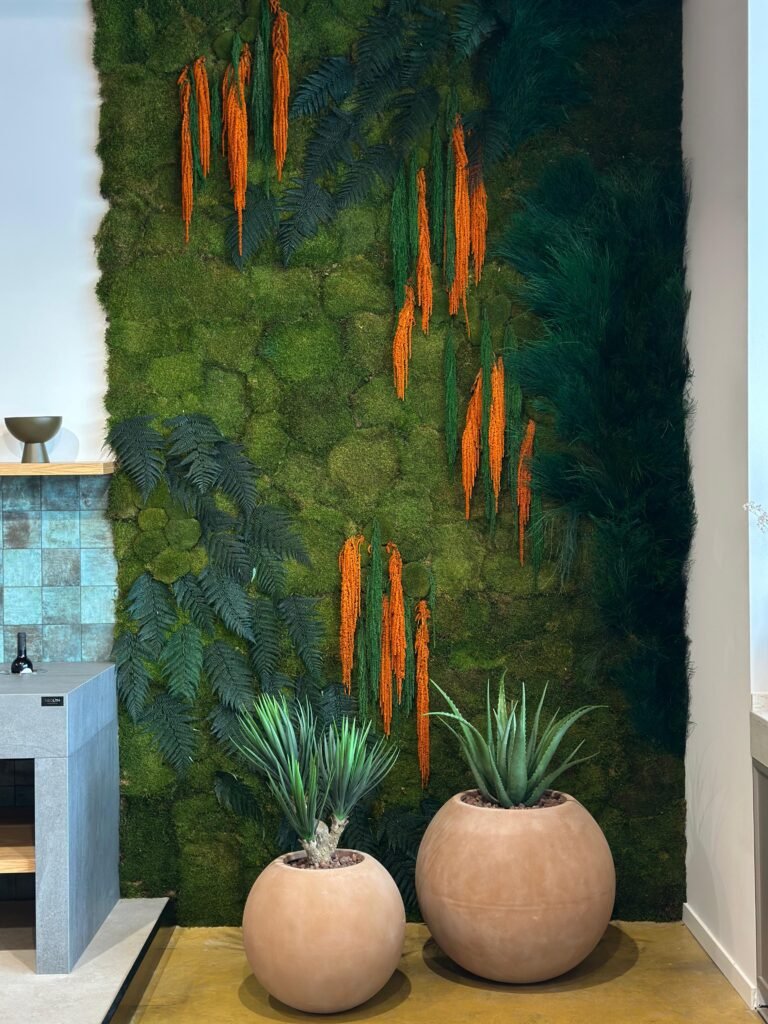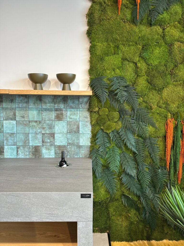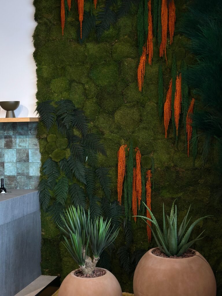 O desafio no showroom da Decorpita era introduzir um elemento vegetal de grande impacto visual que mantivesse a sua beleza intacta, sem a necessidade de luz natural direta ou sistemas de rega que pudessem comprometer o ambiente de exposição. A MossnArt desenhou uma composição personalizada utilizando musgo preservado de várias texturas e plantas selecionadas, garantindo um aspeto fresco e luxuoso permanentemente.