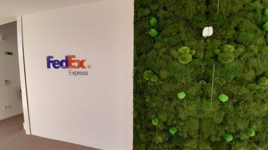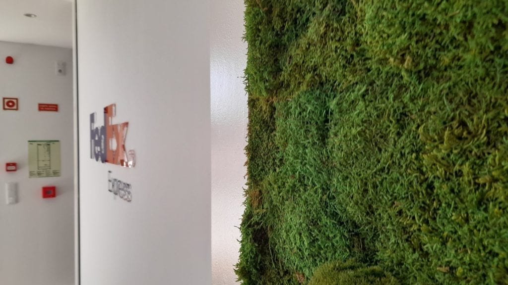 A MossnArt orgulha-se de ter colaborado com a FedEx Express na requalificação dos seus escritórios no centro empresarial Lionesa, no Porto. Projetámos e instalámos um jardim vertical de musgo preservado com uma área de 3,60 m², integrando a natureza diretamente na zona de receção e escritórios de uma das maiores empresas de logística do mundo.