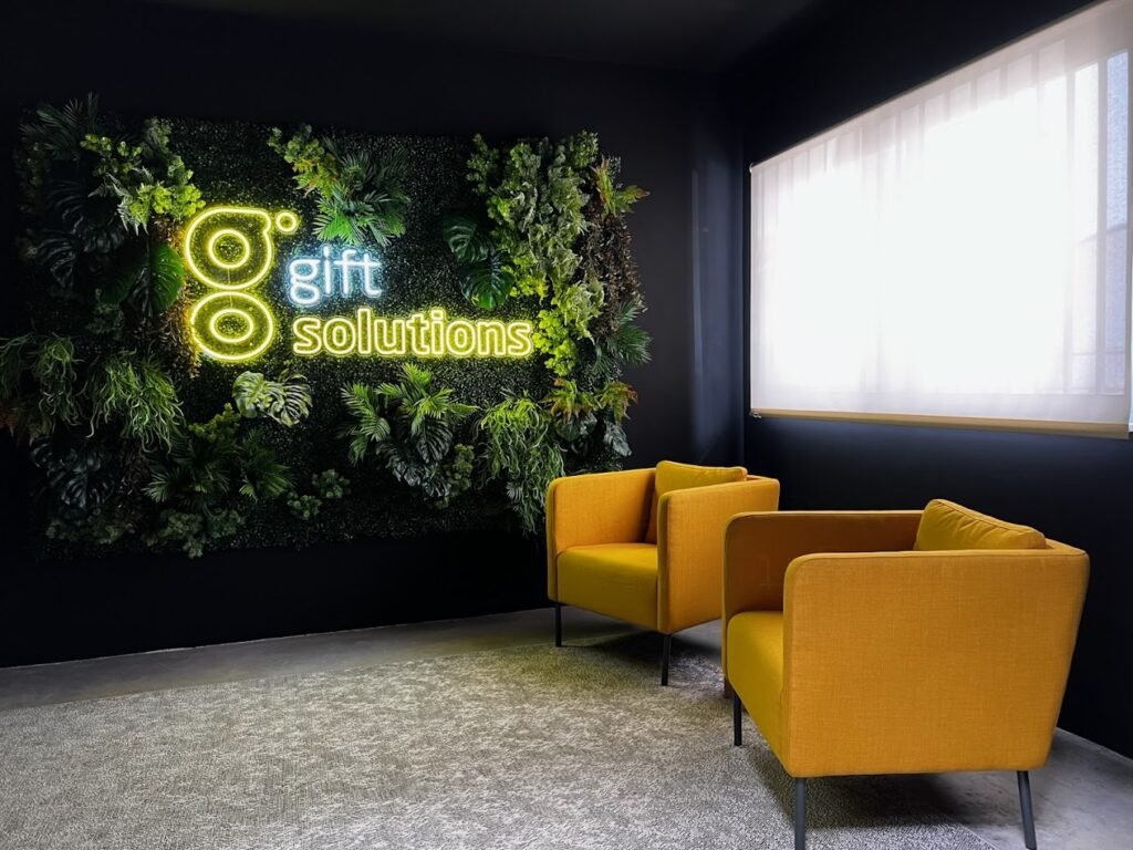 O objetivo da Gift Solutions era modernizar o seu espaço corporativo, tornando-o mais acolhedor para clientes e inspirador para a equipa. A solução da MossnArt passou por um jardim vertical de alta densidade, com texturas que mimetizam plantas tropicais, servindo de moldura para o logótipo em acrílico iluminado/neon, também produzido pela MossnArt e destacando a identidade da empresa sobre um fundo verde profundo e realista.