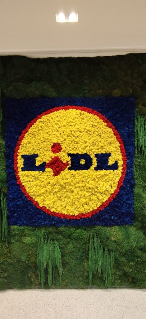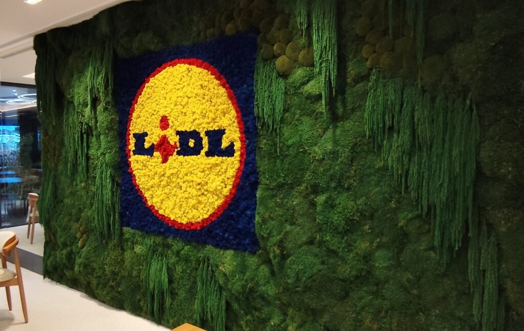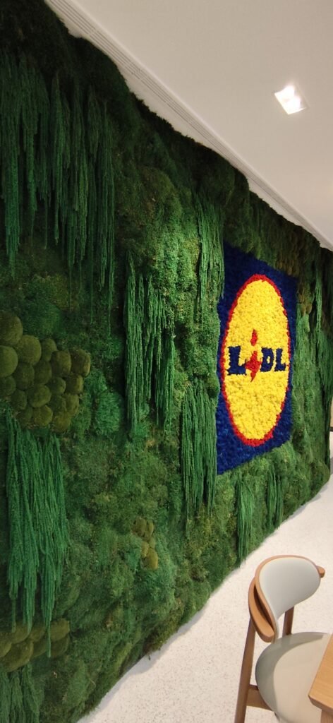 A MossnArt foi a parceira escolhida para elevar a estética da área de convivência dos escritórios gerais do Lidl em Lisboa. Através de um projeto de paisagismo corporativo inovador, integrámos um jardim vertical de plantas e musgos preservados que servem de moldura para o icónico logótipo da marca, totalmente executado em musgo líquen.