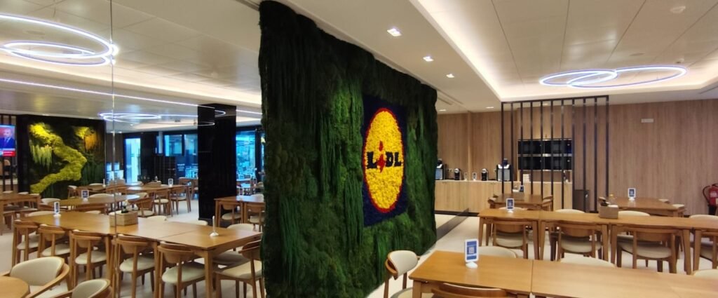 O objetivo era transformar a área de pausa e convívio dos colaboradores num espaço que respirasse os valores de sustentabilidade do Lidl, promovendo simultaneamente a produtividade e o relaxamento. A solução da MossnArt passou pela criação de uma parede verde de grande escala com plantas preservadas, onde o logótipo foi esculpido artesanalmente em líquen amarelo, vermelho e azul, garantindo uma identidade visual poderosa e natural.