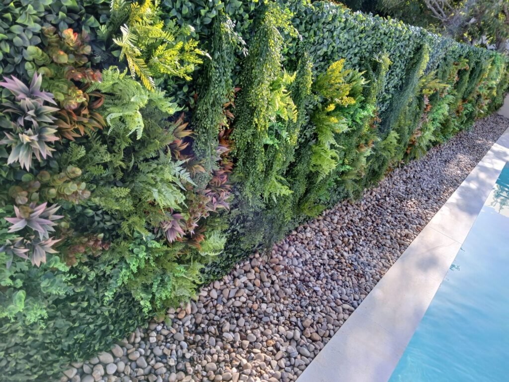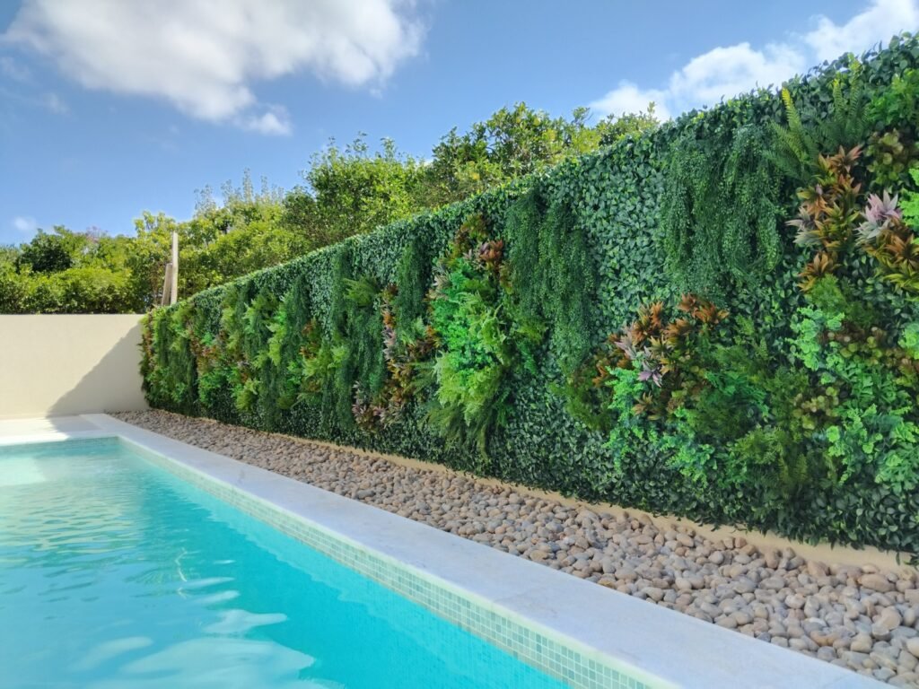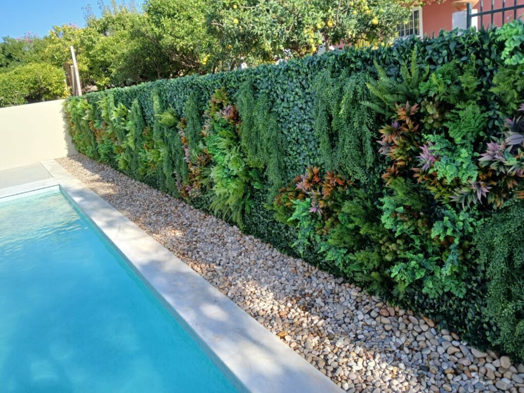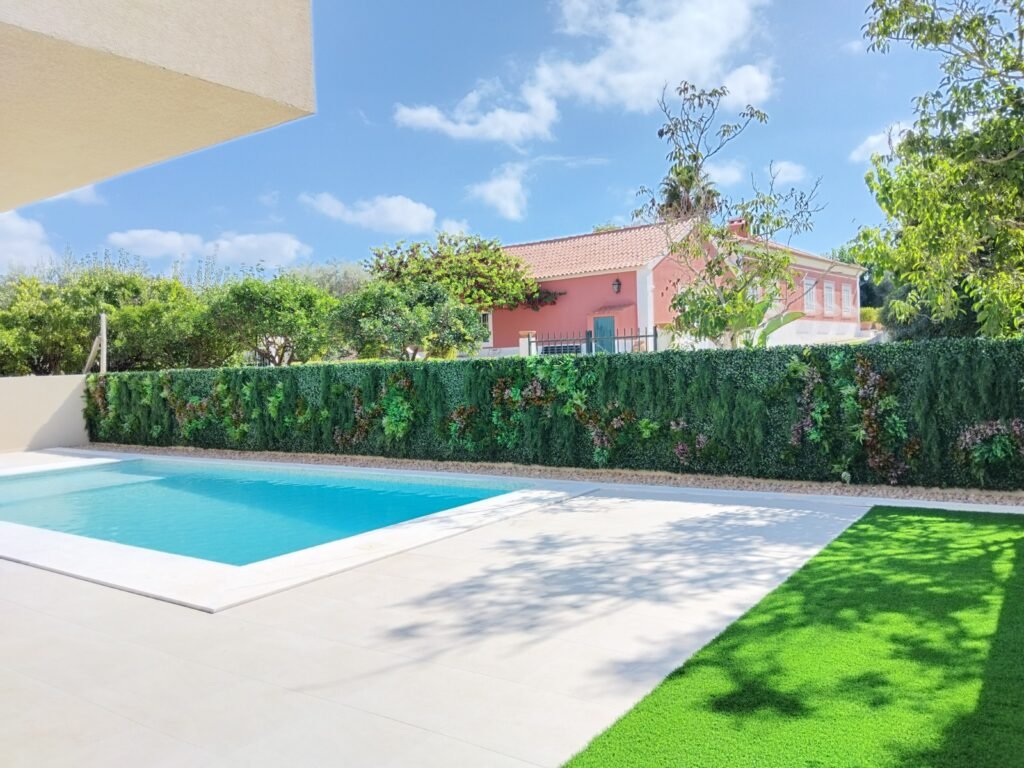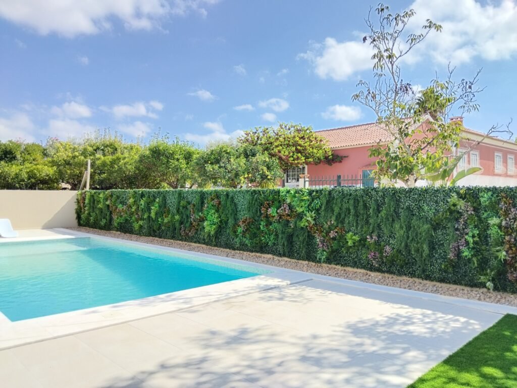 Jardim Vertical Artificial em Lisboa: Biofilia e Luxo à Beira da Piscina