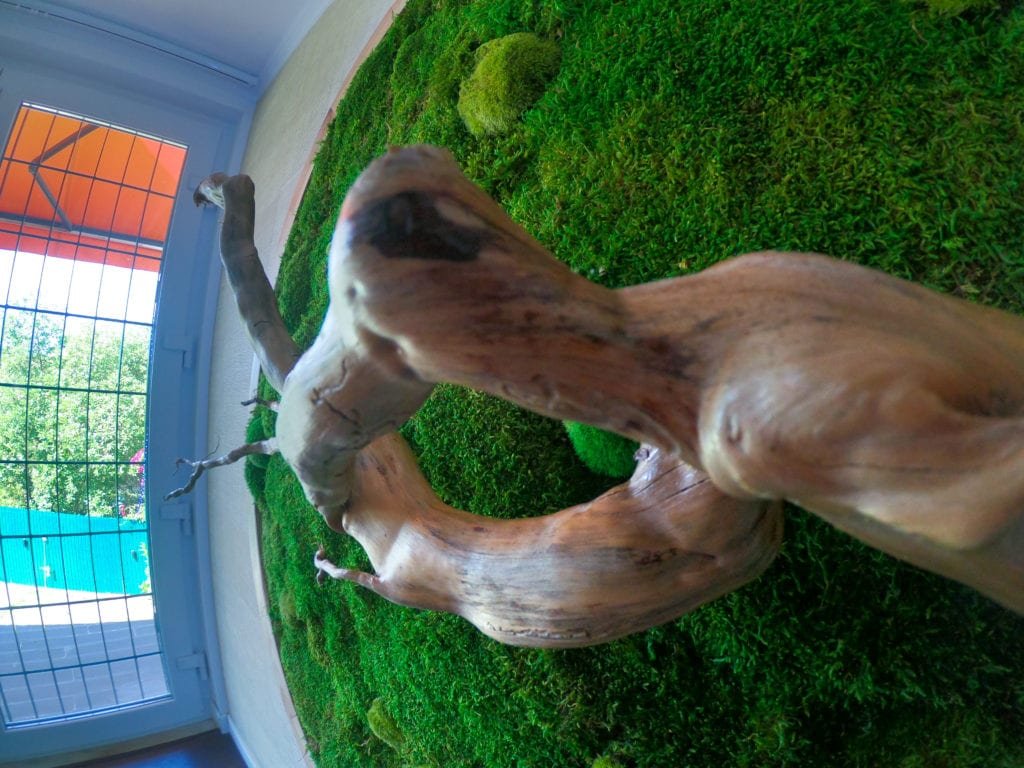 O desafio deste projeto era criar uma peça que dominasse o espaço com elegância, integrando-se numa moradia que privilegia a luz natural e materiais de alta qualidade. A solução da MossnArt passou pelo fabrico artesanal de uma moldura circular robusta em madeira maciça, preenchida com musgo preservado de tonalidade vibrante. Para conferir um aspeto verdadeiramente tridimensional e artístico, foi incorporado um elemento de tronco natural que sobressai da estrutura, complementado por um sistema de retroiluminação LED que realça as texturas durante a noite.