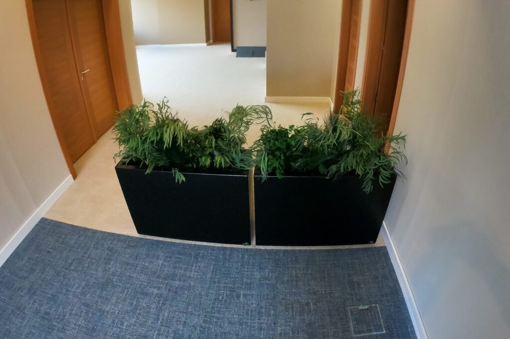 O desafio era humanizar as zonas de circulação e espera do escritório, criando divisórias naturais que não exigissem rega, luz solar direta ou podas constantes. A solução conjunta com a Generosa passou pela instalação de duas floreiras minimalistas de cor preta, preenchidas com uma densa seleção de plantas preservadas de folhagem vibrante. Estas peças atuam como elementos estruturantes que guiam o percurso no escritório e suavizam a estética corporativa.