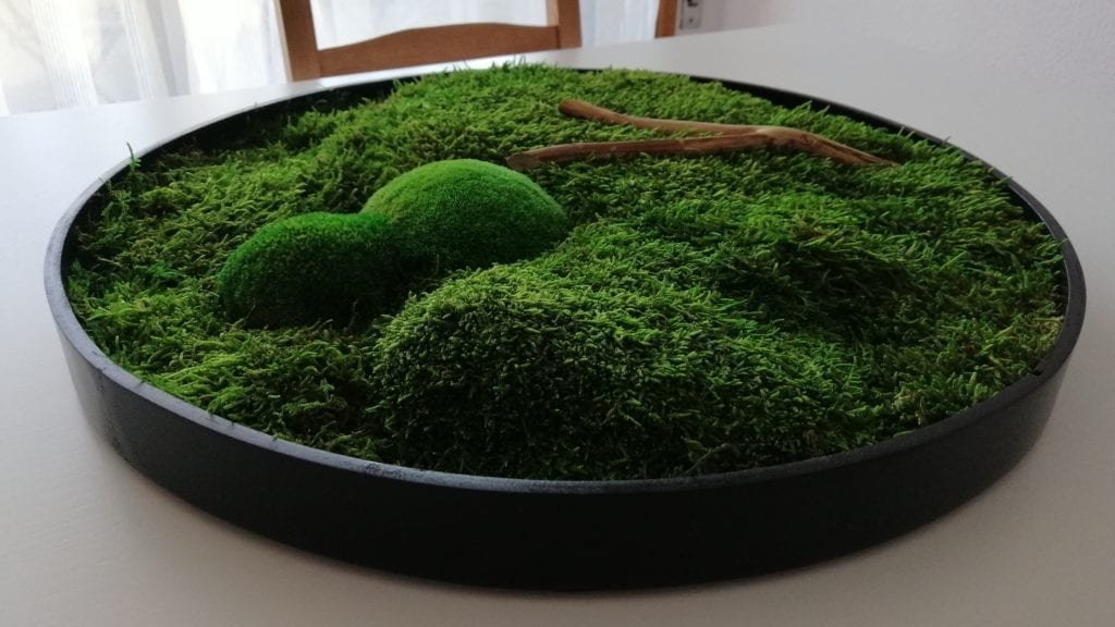 - Conforto Acústico: Mesmo em pequenas dimensões, a densidade do musgo ajuda a suavizar a acústica do espaço, absorvendo pequenos ecos ambientais.
