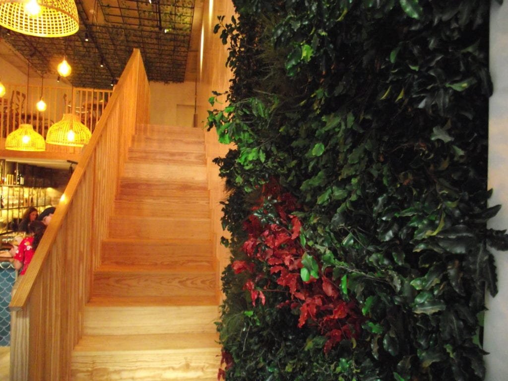 O desafio central neste projeto era preencher a volumetria vertical do espaço sem recorrer a soluções decorativas pesadas ou que exigissem manutenção complexa em altura. A solução da MossnArt passou pelo uso de plantas preservadas de folhagem densa e tons profundos, incluindo nuances de bordeaux que contrastam com a madeira clara das escadarias e do mobiliário. Esta intervenção não só valoriza a arquitetura do restaurante, como também melhora significativamente a experiência sensorial dos clientes.