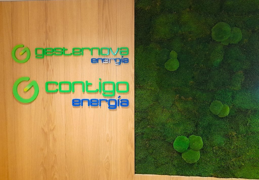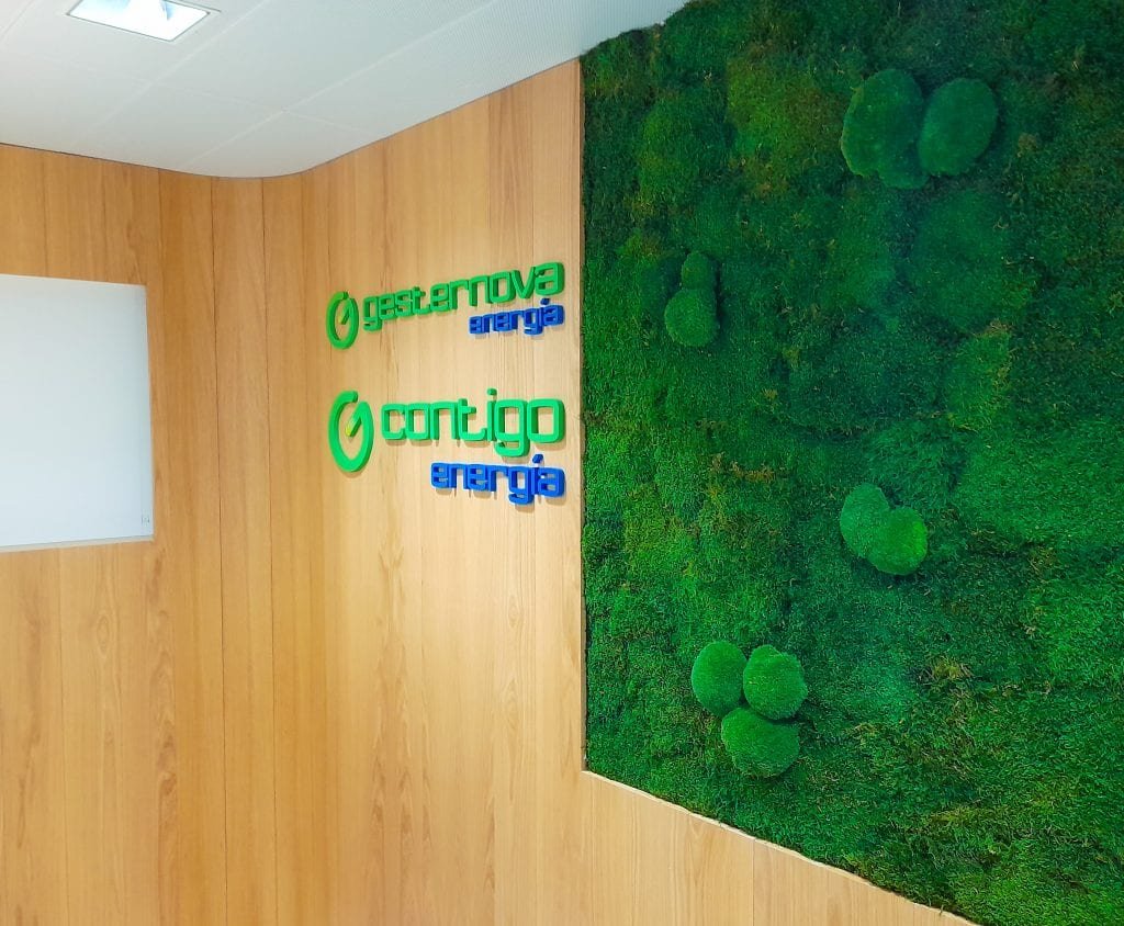 O desafio central neste projeto foi criar uma transição fluida entre os elementos estruturais de madeira e a vegetação, garantindo um acabamento de luxo. A solução da MossnArt passou pela utilização de um mix artístico de Musgo Plano e Musgo Bola (Pole Moss). A densidade e o relevo tridimensional dos musgos bola criam um contraste vibrante contra o painel de madeira adjacente, onde se encontram as marcas do grupo, como a Gesternova e a Contigo Energia.